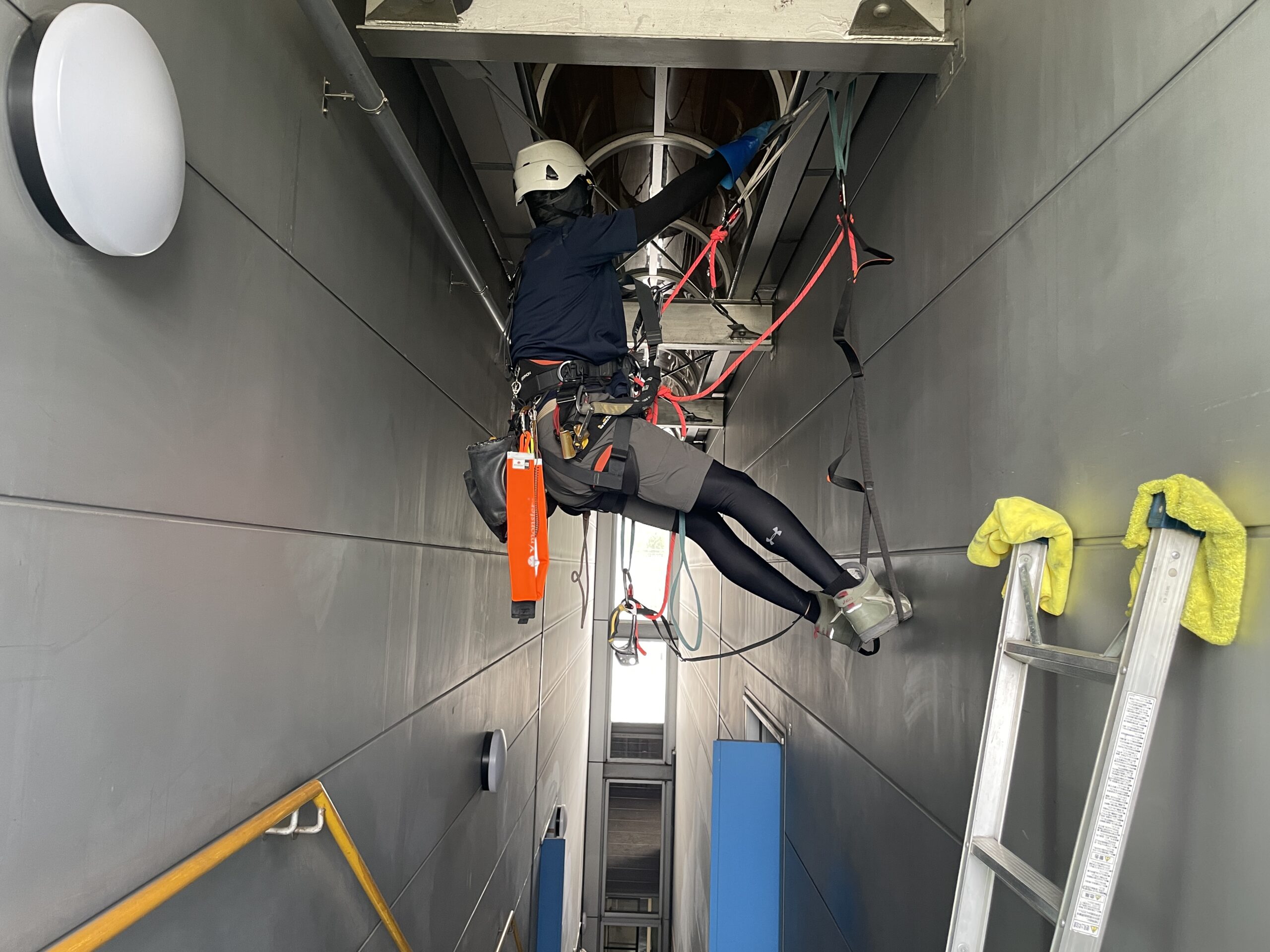 足場を建てないと行えない作業をロープで行います。登高や横移動、様々な場面でロープアクセスの技術が活かせる今主流の技術です。