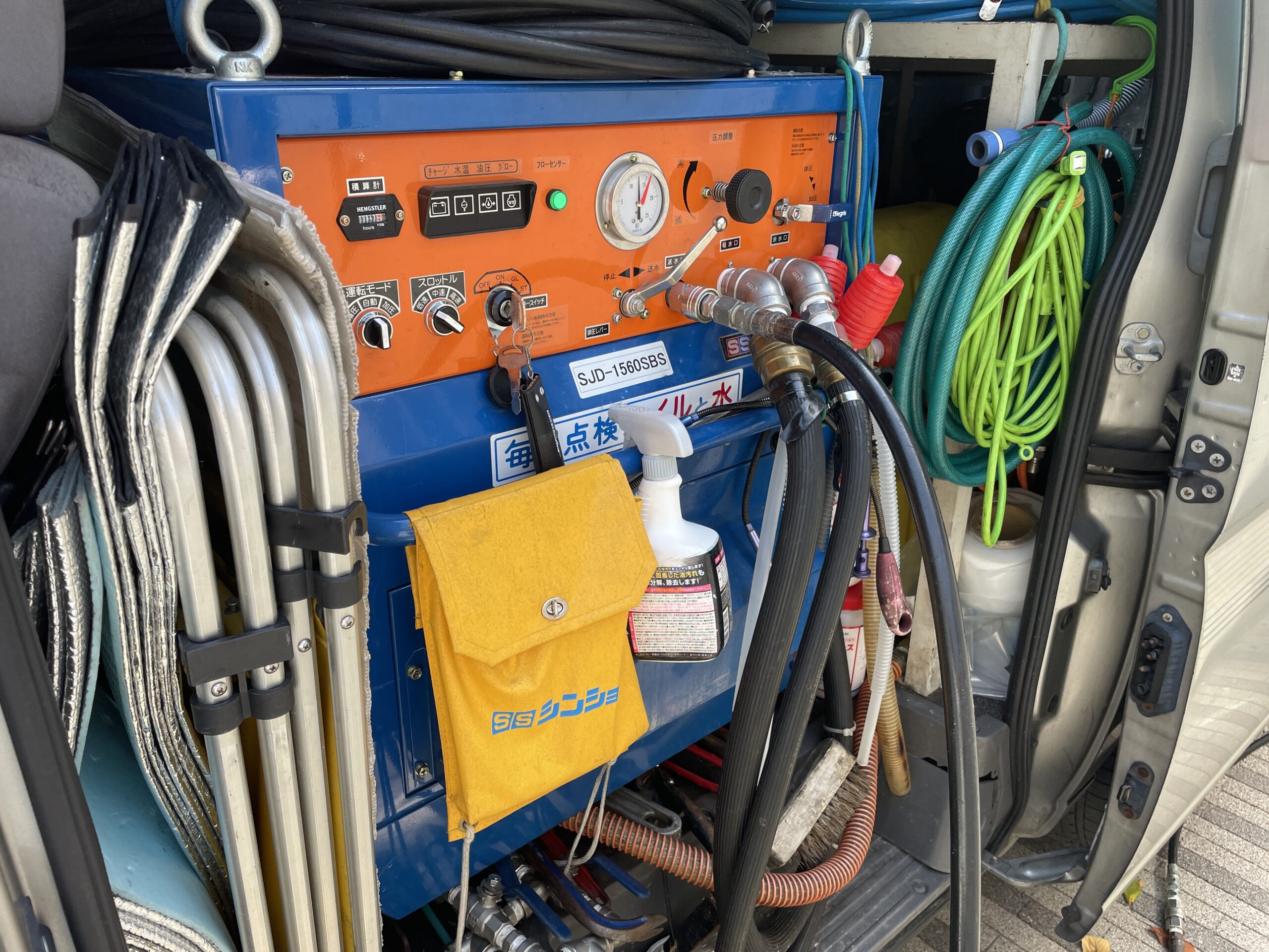 カーペット専用の洗剤吐出機。噴霧器では表面だけに洗剤が付着し内部に浸透せず乾いてしまいます。カーペット内部の汚れまで洗剤を浸透させ分解させます。